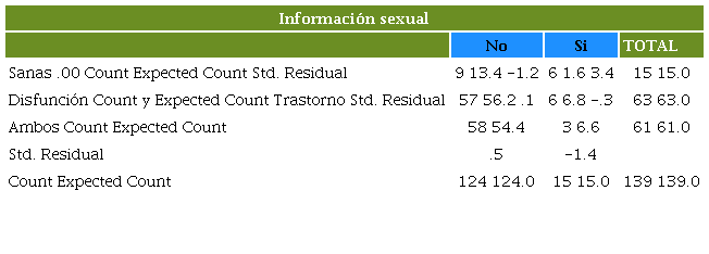 En la historia clínica de la sexualidad se halló que existe una relación entre la información y la no presencia de disfunciones sexuales, con una X2 = .000 y g = 2 (véase Tabla 4).