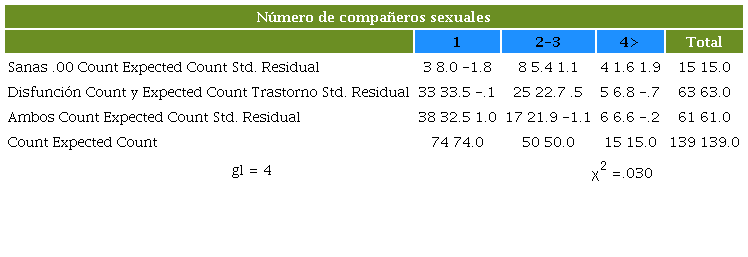 El número de compañeros sexuales también se relacionó con la ausencia de disfunciones sexuales, encontrándose que aquellas mujeres que tuvieron cuatro o más compañeros sexuales no presentaron disfunción sexual, con una x2 =.030 y gl = 4 (véase Tabla 5).