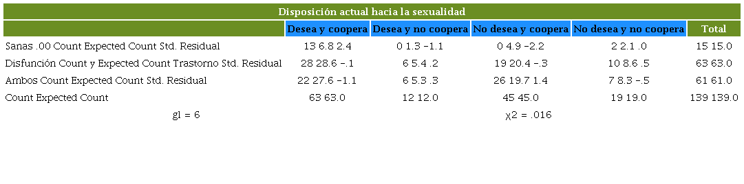 La disposición hacia la sexualidad también se relacionó con la ausencia de disfunción sexual, ya que aquellas mujeres que desean y cooperan en la relación sexual no presentaron disfunción sexual alguna, con una x2 = .016 y gl = 6 (véase Tabla 6).