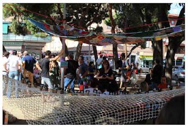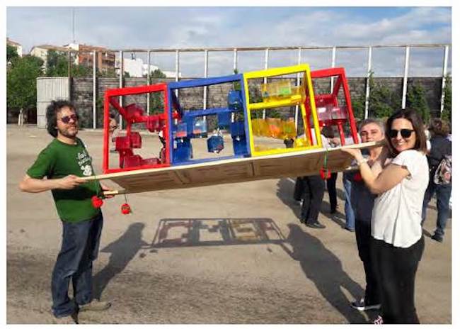 Para ilustrar estas preguntas vamos a tomar dos ejemplos: una escultura colaborativa (Figura 1) y un toldo de ganchillo (Figura 2 y Figura 3) elaborado en el Proyecto ARTYS, la Experimental3. La escultura colaborativa, realizada en 2018, es una obra tridimensional creada por Jorge Fernández-Cedena, investigador-artista becado de posgrado por Madrid Salud. La obra, en el contexto de un evento público, requirió de la participación explícita del público y de los usuarios con el fin de crear su mensaje y significado, lo que, sin duda, plantea cuestiones éticas de autoría: ¿quién es el autor?, ¿quien toma la iniciativa en la creación de dicha obra o los participantes que transforman la propia escultura ofreciendo diferentes alternativas plásticas y significados?
