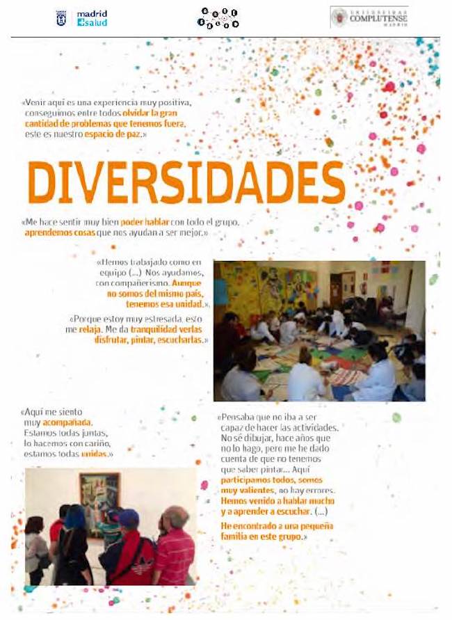 Además, no hay que dejar de destacar que la colaboración entre el organismo Madrid Salud y la Universidad Complutense de Madrid ha sido un modelo de comunidad-académica que ha permitido minimizar la distancia entre la investigación y los servicios de salud, y avanzar hacia una asociación entre estos dos mundos. La incorporación de investigadores y estudiantes del ámbito de las artes en equipos de profesionales de Madrid Salud ha sido una fuente de intercambio y enriquecimiento mutuo. Este trueque de saberes, a través de esta alianza o coalición, ha garantizado cierta estabilidad temporal y económica al proyecto, permitiendo que hoy, casi diez años después de su inicio, investigadores, profesionales y estudiantes podamos reflexionar sobre estas cuestiones teóricas, metodológicas y éticas. Sin duda, sin esta continuidad e intensidad de experiencias no sería posible abrir debates y mostrar los retos de trabajar desde el enfoque de la investigación en salud basada en las artes.