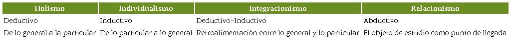 Cada una de las cuatro mereologías identificadas posee enfoques analíticos particulares. El holismo tiende a ser deductivo porque aplica principios abstractos en casos específicos para obtener resultados generalizantes. De forma inversa, el individualismo es inductivo porque parte de un objeto de estudio particular y con base en los resultados empíricos formula una reflexión de mediano alcance. Por su parte el integracionismo realiza un bucle de deducción-inducción en la medida en que a través de múltiples casos utiliza macro-modelos teóricos para explicar la conectividad entre datos particulares y a su vez impulsa la construcción de conceptos mediante casos empíricos. En contraste con las configuraciones lógicas anteriores, el relacionismo es abductivo porque a partir de resultados y de principios analíticos llega a identificar el objeto de estudio (Ver Tabla 1).