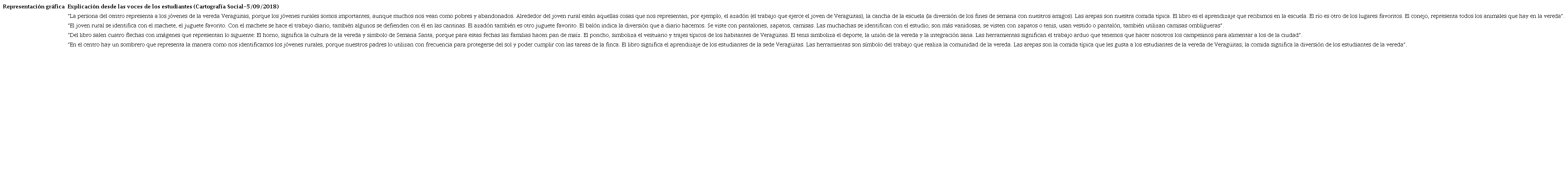 De lo anterior, llama poderosamente la atención, la ubicación de la imagen de los estudiantes en el centro y la significación dada, al considerarlo importante, aunque los vean “como pobres y abandonados”. Se complementa esa imagen con otros elementos representativos de la identidad del joven rural, tales como el machete y el azadón (“juguetes favoritos” que llevan a pensar en la relación de los jóvenes con el territorio y el trabajo agrícola), el sombrero y el poncho como indumentarias de protección y representación del estilo de vestir del campesino.