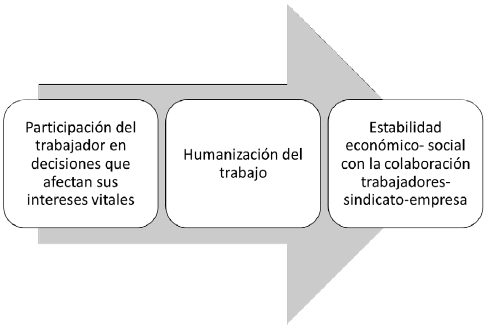 La democratización de la empresa se fundamenta en que “Todos los esfuerzos por parte de los trabajadores, empresas y explotaciones, Parlamentos, Gobiernos y grupos sociales para la configuración de la democracia en el mundo del trabajo tienen como objeto la creación de unas relaciones lo más equilibradas posibles entre las exigencias del trabajador, por una parte, y las exigencias de la producción por otra” (Schmidt, 1977), en garantía de justicia social. Por ello, donde quiera que se desee establecer la cogestión se habrá de tener como referente la experiencia alemana, cuyos objetivos de participar en las decisiones, humanizar el trabajo y alcanzar una estabilidad socioeconómica se pueden visualizar en la Figura 3.