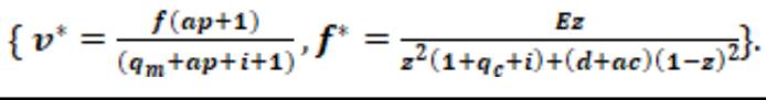 Donde, f* es el número óptimo de ejecuciones extrajudiciales que ordena el alto mando al soldado, v* es el número óptimo de falsos positivos que son llevados a cabo después de dicha orden y E>0 es el porcentaje ideal de falsos positivos; α ϵ [0,1]es la proporción esperada de desobediencia que el alto mando está en la capacidad de observar, i ϵ [0,1] es la probabilidad de un castigo internacional por cometer esta clase de crímenes, qmϵ [0,1] y qcϵ [0,1] son la probabilidad de ser judicializados por las autoridades colombianas del soldado y el alto mando respectivamente. Además, c>0 es lo que le cuesta al alto mando castigar la desobediencia, d ϵ [0,1] es la preocupación del alto mando por proteger su legitimidad y p>0 es la violencia esperada por parte del soldado acerca del castigo impuesto por el principal.