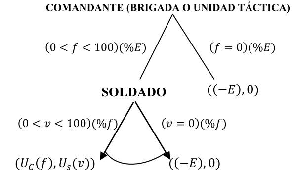 Se parte aquí del supuesto de que los altos mandos del Ejército colombiano no desconocían que este tipo de crímenes estaban ocurriendo. Es conveniente subrayar que entre 2002 y 2008 más de 150 batallones y unidades tácticas pertenecientes a 41 brigadas, subscritas a 7 divisiones existentes, habían cometido falsos positivos (Human Rights Watch, 2015). Por tanto, el juego planteado es entre los altos mandos representados por el comandante del Ejército nacional y otros comandantes subordinados, como los de brigada y unidades tácticas, y los soldados o mandos no superiores como autores materiales de los falsos positivos. Esta interacción ocurría en un contexto en el que las unidades ejercían presión por bajas, motivadas por el incentivo económico procedente de la política de seguridad democrática y por la imposición de un castigo o tomando represalias contra aquellos que no cumplieran órdenes. En este juego se asume que la probabilidad de ser encontrado culpable y judicializado es mayor para un soldado que para un alto mando del Ejército3.