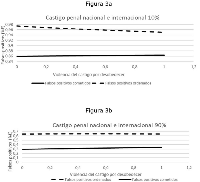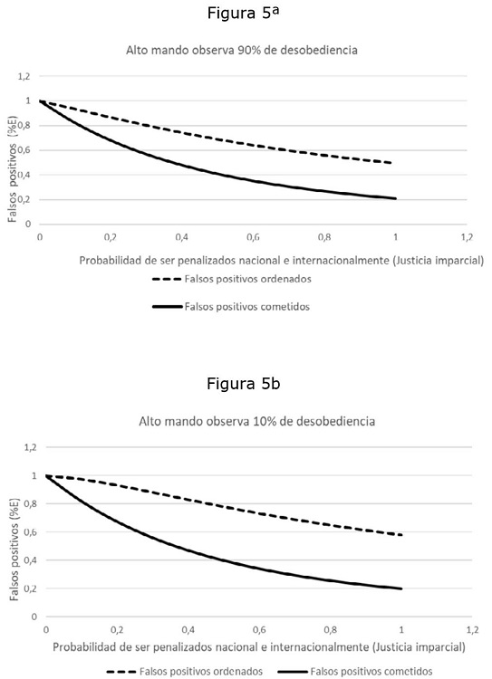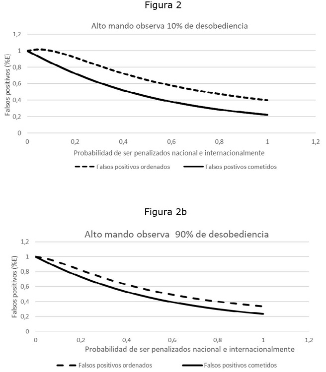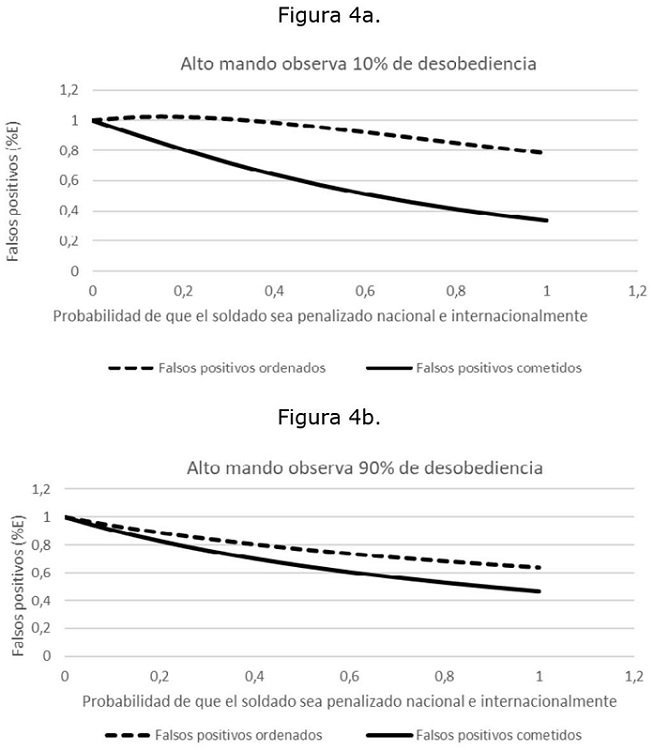 La Figura 2b muestra la relación entre la probabilidad de condena por asesinato de civiles y el número de ejecuciones extrajudiciales cuando el alto mando observa al 90 % de los soldados desobedientes. Cuando el soldado enfrenta una probabilidad del 0,4 de ser condenado por falsos positivos, pero la probabilidad de ser observado por su superior es tan solo 0,1 (α=0,1), la diferencia entre los falsos positivos ordenados y los cometidos es del 43 %; mientras que cuando 0,9, dicha diferencia se reduce a un 32 %. Este resultado se debe a que el alto mando incurrirá en un costo de castigo si la desobediencia observada aumenta, lo que reducirá el número de ejecuciones extrajudiciales ordenadas. Un aumento en la proporción observada de soldados desobedientes va a aumentar la cantidad de falsos positivos que estos cometen, ya que el agente va a buscar evitar el castigo por desobedecer.