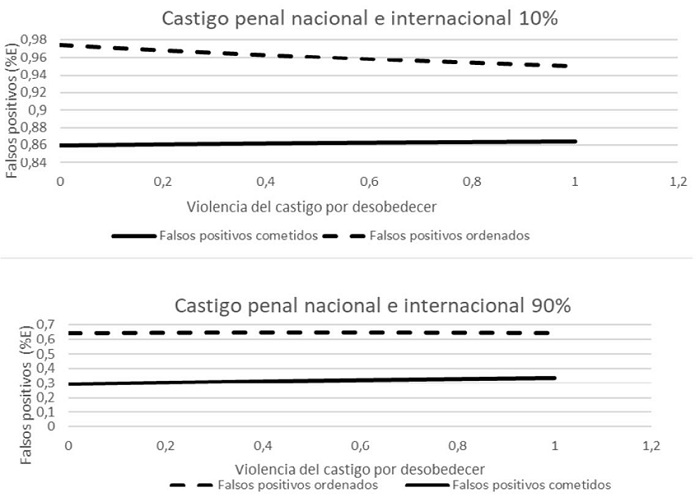Ahora, cuando no existe ninguna clase de castigo, el alto mando ordenará exactamente el número de falsos positivos que necesita para cumplir su objetivo y el soldado cumplirá dicha orden al pie de la letra; de esta manera, el número de civiles asesinados y presentados como bajas en combate será el ideal para que el alto mando logre alcanzar el primer puesto en las estadísticas de bajas y reciba beneficios. No obstante, cuando la probabilidad de condena y de castigo internacional es inminente, tanto el alto mando como el soldado van a tratar de evadir dicho costo, razón por la cual los falsos positivos ordenados disminuirán en un 60 % respecto del ideal y los cometidos aproximadamente en un 78 %.
