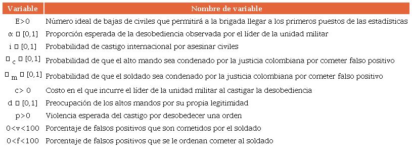 Partiendo del planteamiento de DeMeritt (2015) se modela el fenómeno de los falsos positivos con base en el trabajo de Cárdenas y Villa (2013). En este trabajo, los falsos positivos no serán tratados como hechos aislados, sino como el resultado de la presión por bajas por parte de los altos mandos del Ejército. Debido a la fuerte estructura jerárquica de las fuerzas armadas colombianas, el militar no solo estaba impulsado por su beneficio personal, sino también por la presión del comandante y por el probable castigo por desobediencia, que actuaba como un incentivo más para llevar a cabo el asesinato de civiles2. Además, aspectos como el castigo judicial o internacional por dicho crimen pueden afectar la elección del militar entre obedecer o desobedecer la orden.