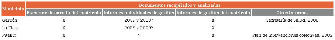 El estudio tuvo un abordaje cualitativo de tipo descriptivo-analítico con diseño documental. Para ello, se integraron aspectos fundamentales de descripción, análisis y evaluación de los planes de desarrollo, informes de gestión cuatrianuales y anuales, y otros informes rescatados de los municipios de Garzón, La Plata y Pitalito, en el Departamento del Huila. Estos tres municipios son los que más habitantes tienen en el Departamento en mención, después de su ciudad capital. También, todos ellos tienen un alto dinamismo económico que contribuye al PIB departamental (Delgado et al., 2015). Lo anterior se debe, en parte, a que son municipios con una alta producción de café, explotación minera (arcillas y calizas), dinamismo en el área de construcción, entre otros. En materia de la promoción y protección de los derechos a las mujeres, los municipios considerados no presentan instituciones especializadas que velen por ellos como, por ejemplo, refugio para mujeres y comisaría de protección a la mujer.