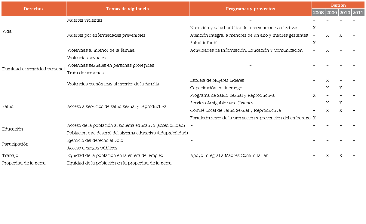 Como se aprecia en la Tabla 2, los derechos humanos considerados para este estudio tienen una escasa relación con los planes e informes de gestión del municipio de Garzón. Los programas que se dirigen explícitamente a la defensa de los derechos de las mujeres fueron de corta duración, de poca cobertura, y se observó la ausencia de una directriz que promoviera el enfoque de género y la integralidad de las acciones. Como se verá más adelante, esta también fue una tendencia en los otros dos municipios estudiados.