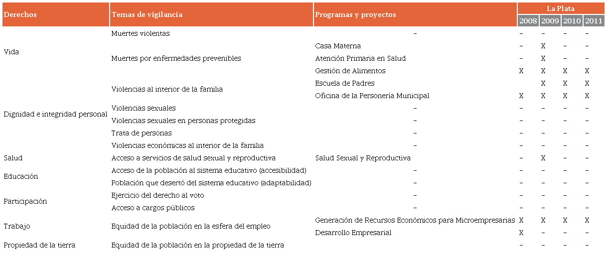 Entre los documentos públicos revisados en el municipio de La Plata, se encontró que para proteger el derecho a la vida se plantearon 6 programas para desarrollar durante el cuatrienio. Entre estos, sólo 3 de ellos fueron mencionados en el Plan de Desarrollo, pero no en los informes de gestión. Los programas fueron: Aseguramientos en Salud, Salud Pública, y Salud para todos los plateños. Sobre este último, se encontró que entre sus propósitos se realizaría la prestación de los servicios de atención en control prenatal, de parto, nacimiento, puerperio, interrupción voluntaria del embarazo, etc. Estos programas no fueron incluidos en la Tabla 3, ya que aparentemente no se ejecutaron o no cuentan con la descripción de sus resultados. Por otra parte, los siguientes tres programas sí se incluyeron en los informes de gestión. El programa Casa Materna, que tuvo una vigencia de sólo 1 año (2009), atendió a 40 mujeres gestantes en condición de vulnerabilidad procedentes de las zonas urbanas-marginales y rurales, desde ahí se contribuyó con alimentación, atención psicosocial y de enfermería, y desarrollo de estrategias mediante Instituciones Amigas de la Mujer y la Infancia (LAMI). El programa Atención Primaria en Salud, que entre sus acciones buscó facilitar la detección del cáncer de cuello uterino, tuvo la misma vigencia que el anterior y atendió a 32 pacientes. Por último, Alimentos a las Mujeres Desplazadas fue un programa que estuvo en ejecución durante 4 años (2008-2011) y atendió a 95 mujeres gestantes y microempresarias. En relación con acciones que previnieran las muertes violentas -uno de los temas de vigilancia dentro del derecho a la vida-, los informes del municipio de La Plata no evidencian ninguna. Los programas relacionados anteriormente estuvieron a cargo de la Alcaldía Municipal, la Secretaría de Salud Departamental, la Empresa Social del Estado (ESE) San Sebastián, los programas nacionales Acción Social y el Instituto Colombiano de Bienestar Familiar (ICBF), así como el programa internacional Programa Mundial de Alimentos (PMA).