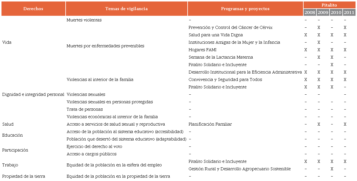 Por último, la agenda municipal de Pitalito incluyó algunos programas que aportaron a la protección de los derechos de las mujeres (ver Tabla 4). En lo relativo al derecho a la vida, este municipio desarrolló 6 programas que aportaron en la atención de muertes por enfermedades prevenibles. Así mismo, anunció en su Plan de Desarrollo realizar actividades publicitarias para dar mayor cobertura a los programas de salud para las mujeres. Sin embargo, estas acciones no se reportaron en el informe de gestión. El primer programa se llamó Prevención y Control del Cáncer de Cérvix y fue ejecutado en los años 2009 y 2011. En su primer año, el programa ayudó a detectar la enfermedad en etapa temprana en 7.386 mujeres, de un total de 10.272 citologías tomadas; para el segundo año, los informes no especificaron resultados. El segundo programa fue Salud para una Vida Digna, el cual atendió tanto los temas de vigilancia del derecho a la vida como los de salud; este estuvo activo durante todo el cuatrienio y creó 6 bases de datos para establecer metas en relación con muertes perinatales, control prenatal y planificación familiar.