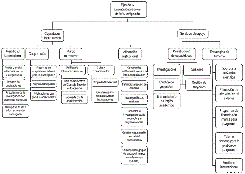Las áreas o ejes estratégicos sobre los cuales se debe desarrollar la internacionalización de la investigación en países emergentes, teniendo en cuenta el ejemplo de Colombia, se divide según lo expresado por los entrevistados en dos grandes categorías: Capacidades Institucionales y Servicios de Apoyo. En la categoría de “Capacidades Institucionales” se observan las subcategorías: visibilidad internacional, cooperación, marco normativo y alineación institucional. Para la visibilidad internacional es clave establecer redes y capital relacional, así como medir el impacto de las publicaciones, trabajar el perfil internacional de los investigadores y articular la investigación con problemas globales. Para la subcategoría “cooperación”, se evidencia la necesidad de cooperar para publicaciones y proyectos conjuntos, así como para la gestión de recursos internacionales. Toda estrategia de internacionalización de la investigación, según los entrevistados, debe contar con un “Marco Normativo” que permita su desarrollo, por lo cual se sugiere contar con una política de internacionalización que incluya el área misional de la investigación, la cual deberá ser expedida en el mejor de los casos por parte del Consejo Superior de la IES. Igualmente se debe contar con guías y procedimientos frente a la productividad de los investigadores y la propiedad intelectual. Asimismo, se debe crear la respectiva “Alineación Institucional”, articulando la investigación a misiones y prioridades institucionales, contando con un compromiso institucional para llevar a cabo procesos de internacionalización, así como institucionalizando alianzas para la internacionalización de la investigación. Además, se requiere la articulación entre las áreas misionales (investigación, docencia y extensión), por ejemplo, por medio de un comité para que el conocimiento generado se gestione y apropie.
