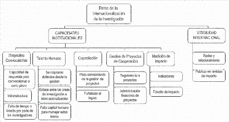 Los retos evidenciados para la internacionalización de la investigación se encuentran divididos en dos categorías: “capacidades institucionales” y “visibilidad internacional”. En “capacidades institucionales” se observan las siguientes subcategorías: “requisitos convocatorias”, “talento humano”, “capacitación”, “gestión de proyectos de cooperación” y “medición de impacto”. Al revisar la subcategoría de “requisitos convocatorias”, se observa que aún es un reto contar con el interés de investigadores para aplicar a convocatorias internacionales; asimismo, algunas convocatorias tienen requerimientos de infraestructura que las instituciones no poseen, así como en ocasiones no se cuenta con la capacidad de responder rápidamente a convocatorias internacionales. Al revisar “talento humano”, se evidencia que aún faltan encargados de estos temas desde la gestión y que se debe contar con personas enlace entre internacionalización e investigación. En cuanto a la “capacitación”, se debe fortalecer aún más el idioma inglés y entrenar al personal tanto académico como de gestión en el manejo de proyectos internacionales. Frente a la “gestión de proyectos de cooperación”, se requiere contar con las condiciones para administrar financieramente estos proyectos y realizar los seguimientos correspondientes. También se requieren indicadores y estudios de impacto para evidenciar las potencialidades y beneficios de la investigación internacional. En cuanto a la categoría de “visibilidad internacional”, se evidencia como reto la gestión de redes y relacionamiento internacional, así como publicar en revistas internacionales de impacto.