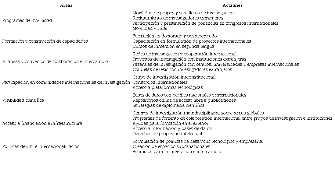 Por su parte, la cooperación internacional cobra una dimensión importante cuando se habla de investigación, puesto que posibilita la gestión de convenios y alianzas estratégicas de tipo institucional y empresarial, impulsadas por la generación de redes de colaboración científica y tecnológica (Sebastián, 2003). Asimismo, Marconi et al. (2019), afirman que para la promoción de una estrategia internacional de alianzas es indispensable que las IES promuevan la conformación de grupos interdisciplinarios con colaboradores internacionales que aborden temas de interés global, y establezcan relaciones significativas y equilibradas con propósitos reales para financiar acciones de investigación. Por otro lado, el dominio de otro idioma permite que el conocimiento se incorpore en diferentes culturas y líneas de investigación, de tal forma que se avanza hacia publicaciones conjuntas como resultado de la cooperación académica (Rojas et al., 2020). En efecto, es primordial que en la gestión de la internacionalización de la investigación se prioricen las siguientes áreas y acciones referenciadas en la Tabla 1.
