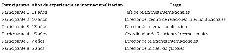 Un grupo de entre cuatro y ocho participantes suele ser ideal para el desarrollo del grupo focal (Kitzinger, 2005). En este caso, se citaron siete gestores y participaron seis. Se utilizó la técnica de muestreo intencional, la cual busca reunir a un grupo de personas que tengan ciertas características en común o compartan experiencia sobre un tema en particular (Weare, 2013). El uso del muestreo intencional requiere que el investigador tenga acceso al participante con deseo de colaborar en la interpretación de un fenómeno (Patten & Galvan, 2019). En este sentido, los participantes seleccionados al interior del equipo de investigación cuentan con amplia experiencia y trayectoria como gestores de internacionalización, representan direcciones y coordinaciones de oficinas de internacionalización de IES en Colombia como se observa en la tabla 3:
