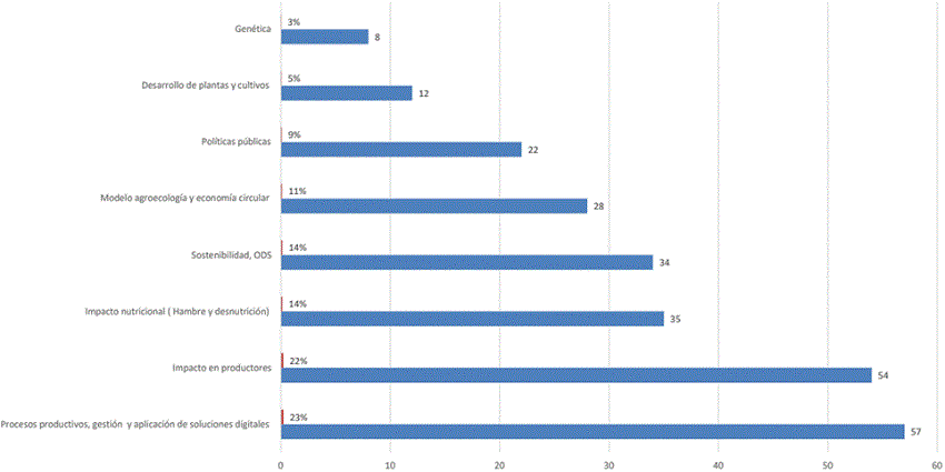 Del análisis realizado se encuentra que los procesos productivos, la gestión, la aplicación de soluciones digitales y el impacto a los productores acumula el 45 % de las publicaciones de los tres años, en tanto que los dos siguientes elementos son el impacto en la nutrición y la pobreza, y las dificultades para alcanzar la sostenibilidad y los objetivos de desarrollo sostenible. El 11 % de los artículos analizados proponen modelos de agroecología y economía circular, un 9 % llama la atención sobre la importancia de la gobernanza en el sector y el desarrollo de políticas públicas, conducentes a solucionar los problemas provocados y bajar el impacto de los estructurales, y el 8 % se centra en el desarrollo de las plantas, su genética y los cultivos.