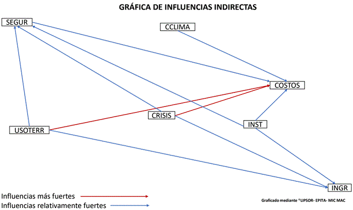 A continuación, se puede apreciar el gráfico de influencias indirectas más fuertes, donde es posible ver cómo los costos y precios se encuentran muy influidos por los demás elementos del sistema, y donde el uso de la tierra y la crisis por cuenta de reducción en la demanda son las influencias más fuertes en los costos de los productores. También resultan muy influidos los ingresos y liquidez de los productores agrarios, y la seguridad alimentaria.