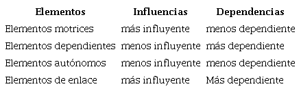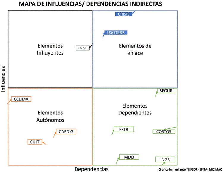 Análisis estructural mediante el empleo de multiplicación de matrices de impacto cruzado, aplicada con fines de clasificación (MIC MAC). En esta etapa de análisis estructural se realizó un ejercicio de valoración de influencias y dependencias entre los elementos para reconocer aspectos del funcionamiento del sistema y clasificar estos elementos de acuerdo con su poder de incidir sobre los demás.
