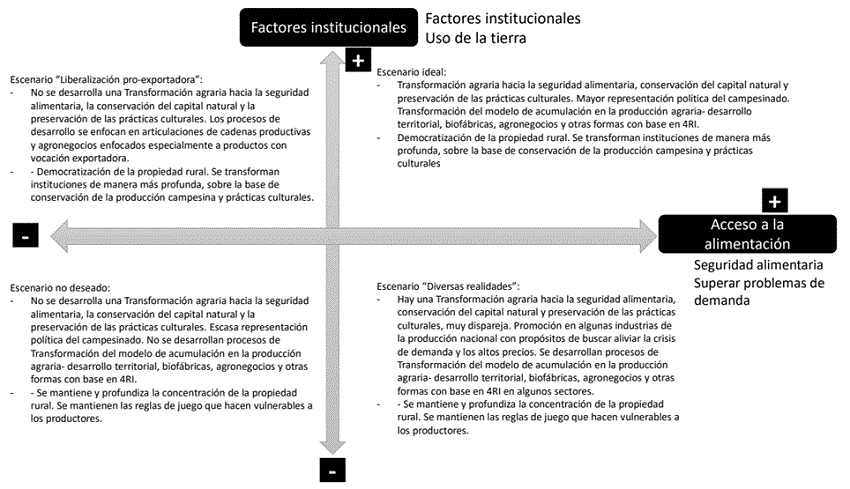 Escenario ideal: (condiciones favorables en ambas categorías). Transformación agraria hacia la seguridad alimentaria, conservación del capital natural y preservación de las prácticas culturales. Mayor representación política del campesinado. Transformación del modelo de acumulación en la producción agraria- desarrollo territorial, biofábricas, agronegocios y otras formas con base en 4RI.