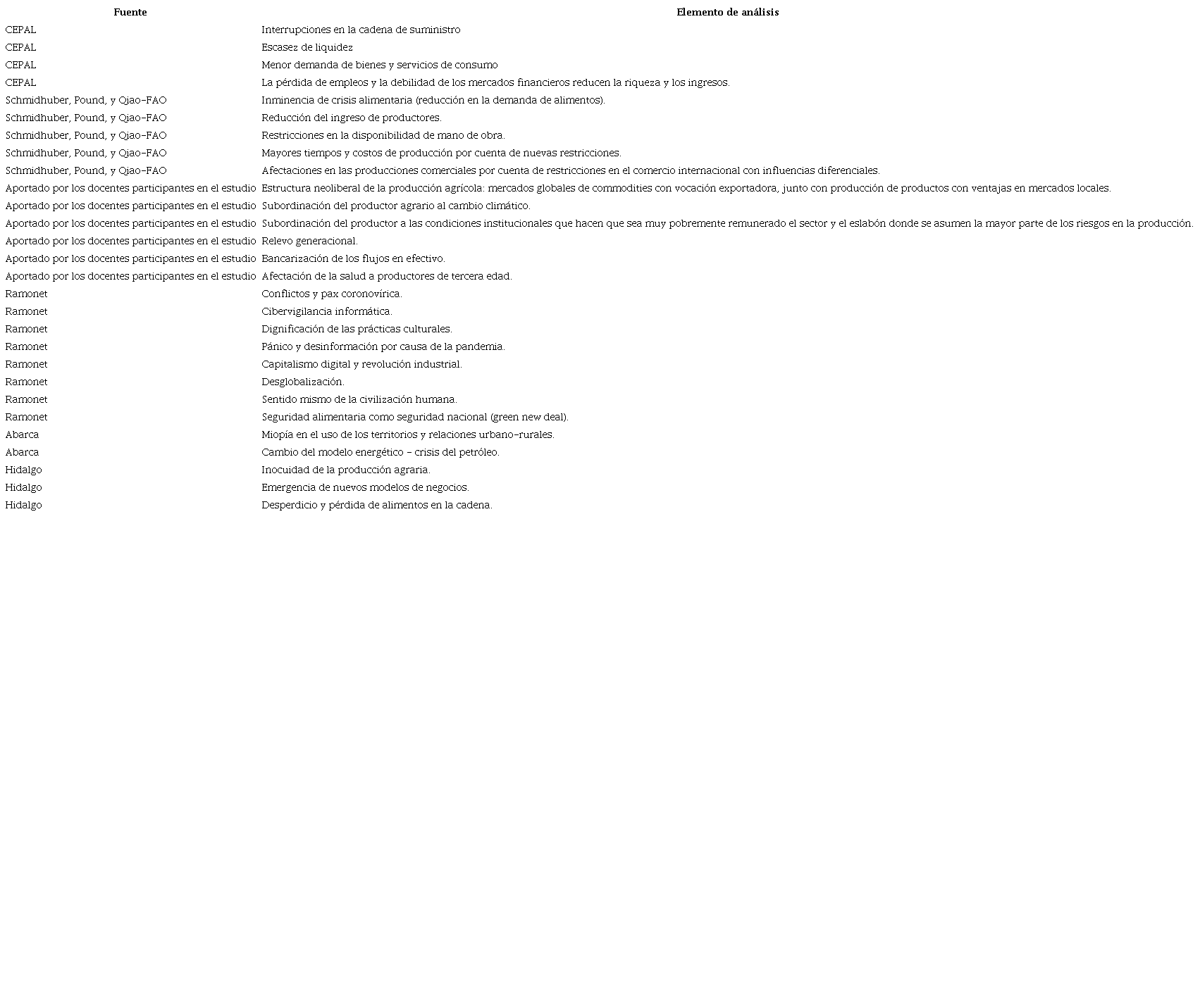 Elementos de análisis con base en las fuentes identificadas. A partir de las estrategias de búsqueda descritas, se enunciaron 29 elementos de análisis provenientes de la lectura crítica de los documentos mencionados. En la siguiente tabla se listan los elementos de análisis de acuerdo con sus fuentes: