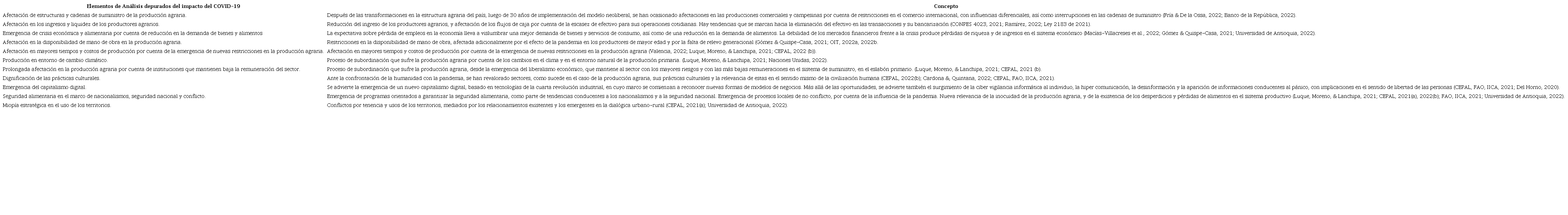 Enunciación de la problemática y variables. El problema central está relacionado con la identificación de escenarios futuros para la producción agraria colombiana, reconociendo las afectaciones causadas por la pandemia de la enfermedad COVID-19, a partir de elementos clave de análisis, los cuales provienen de la revisión de la literatura y del trabajo con los docentes invitados.