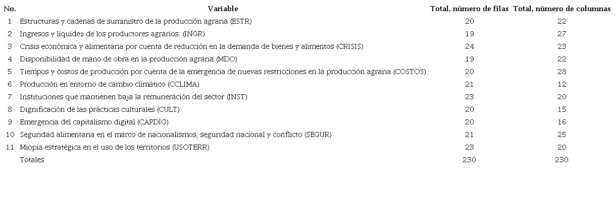 Enunciación de la problemática y variables. Se identificó como problemática la identificación de líneas de acción en el marco de posibles escenarios alternativos de futuros para la producción agraria colombiana, reconociendo las afectaciones causadas por la pandemia de la enfermedad COVID-19 desde un enfoque prospectivo. Esta problemática permitió avanzar en la identificación de variables que se convierten en la siguiente etapa en elementos de análisis del problema.