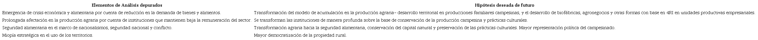 Escenario no deseado: (condiciones desfavorables en ambas categorías). No se desarrolla una transformación agraria hacia la seguridad alimentaria, la conservación del capital natural y la preservación de las prácticas culturales. Escasa representación política del campesinado. No se desarrollan procesos de transformación del modelo de acumulación en la producción agraria- desarrollo territorial, biofábricas, agronegocios y otras formas con base en 4RI.