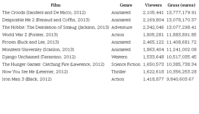 Next, the second step in the development of netnography entails collecting data (Kozinets, 2002). The films selected for the study were the ten highest-grossing films in Spain in 2013 (Ministry of Education, Culture, and Sport, 2013), as shown in Table 1.
