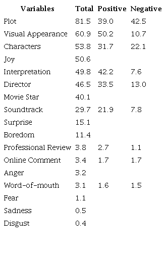 The third stage of netnography is the analysis and interpretation of the collected messages. First, themes relevant to the research hypotheses were identified, and then emerging themes were compared with preconceptions derived from the literature. The variables used to analyze the viewers’ comments were based on the model proposed by Hennig-Thurau et al. (2006), which was previously explained. Thus, the variables included in the work are: Plot, Visual Appearance, Characters, Interpretation, Director, Movie Star, Soundtrack, Professional Review, Online and Word-of-Mouth Comments. Subsequently, they were divided into two opposite categories (for example, Good or Bad Interpretation) to include the positive or negative comments of each review in the corresponding category. However, the variable on the participation of a movie star and the emotions (joy, surprise, boredom, anger, fear, sadness, and disgust) were considered dummy variables, that is, whether or not they were present in the comment analyzed. In summary, all variables were categorical, a type of scale used in film research (Canini et al., 2009). That is, for each comment analyzed, the presence or absence of the variables derived from the literature was compared.
