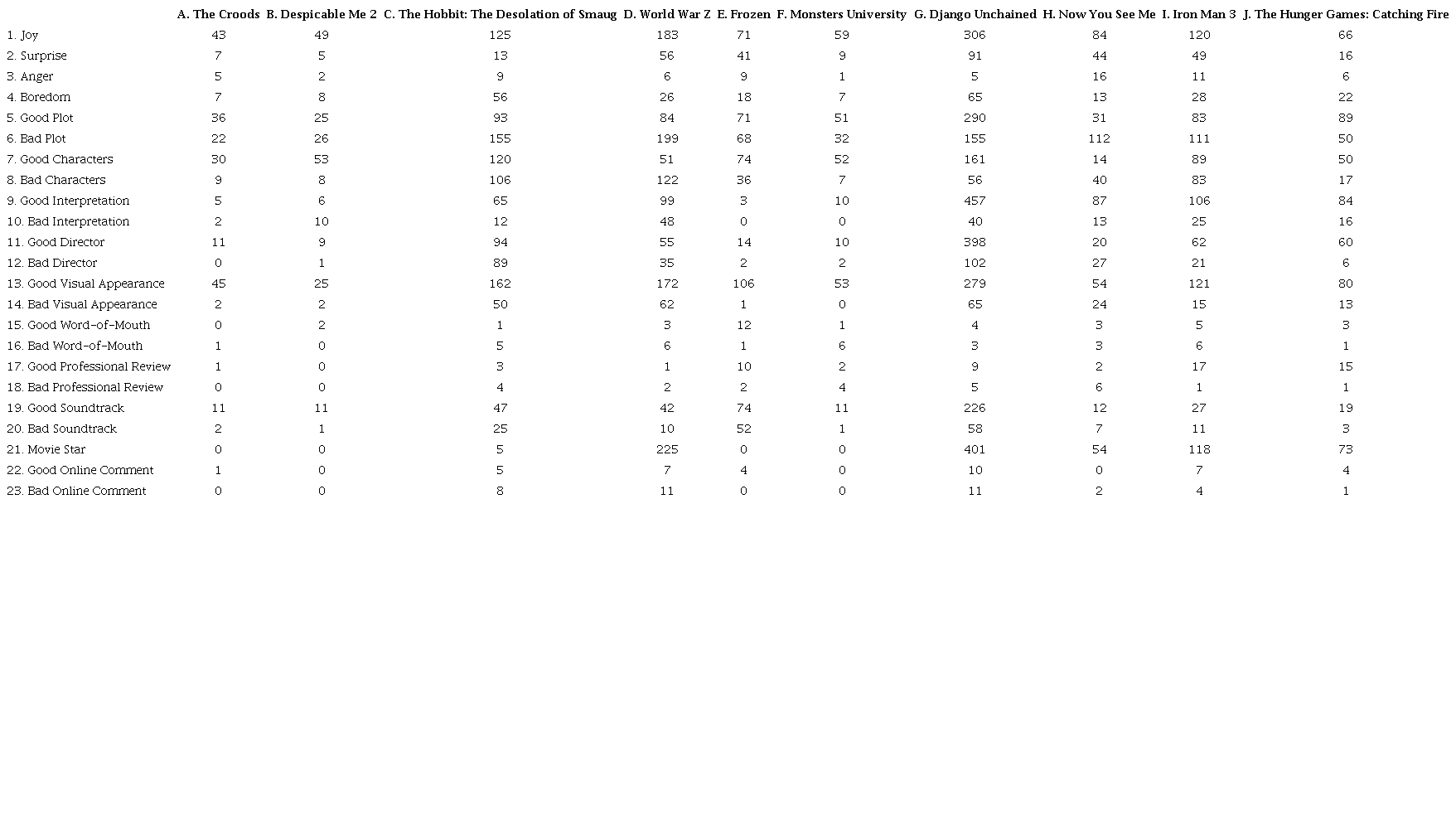 To a lesser extent, four variables were mentioned in between 3% and 4% of the comments, such as Professional Review, “most critics have praised it to the skies” (Opinion 22). Some online comments say “some criticize it for spoiling almost all the action scenes in the trailer (they are right about that) and others claim that it is an example of how to make a zombie movie without overusing gore” (Opinion 23). The anger feeling is reflected in comments such as: “a movie that made my indignation and anger increase as the footage went by” and the word-of-mouth: “the only thing I hear (and heard before watching it) is that it’s ‘very original’ and ‘it breaks Disney’s typical archetypes” (Opinion 24).