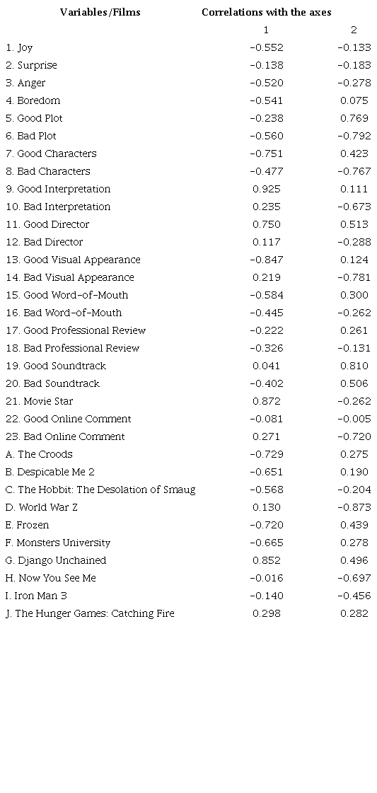 When interpreting the comments associated with each axis, we looked for those variables and films that show significant correlations. Thus, considering the results of Table 5 and the perceptual map (Figure 2), it can be noted that the first axis opposes variables such as Good Interpretation, Movie Star, and Good Director at the positive end of the axis, against Good Visual Appearance and Good Characters in the negative end. That is, this first dimension identifies variables focused on human performance (Director, Interpretation and Movie Star) and in opposition, Visual Appearance and Characters are placed as concepts of the film’s environment. In this case, on the one hand, the concept of the human performance is related to the film Django Unchained as the next comments exemplify: “if we put together a great director, great actors (no doubt that Christoph Waltz, Leonardo di Caprio and Samuel L. Jackson are 3 beasts on the screen) and a great story, we get what we were looking for” (Opinion 26) or