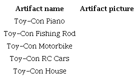 The variety kit "Toy-Con 01" offers the possibility to build, play, and explore with five "artifacts" that can be built using pre-made cardboard sheets (that serve as a "mold" to construct the artifacts), reflective stickers, sponge sheet, strings, set of grommets, and rubber bands. The artifacts included in the set are listed and displayed in table 1: