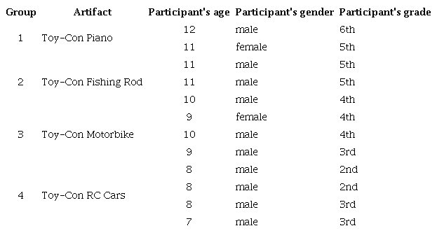 The participants of this study were twelve kids, whose ages ranged from eight to twelve. These kids were grouped and assigned one artifact to build as displayed in table 2.