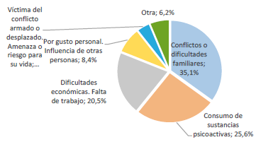 El Censo de Habitantes de Calle realizado en Bogotá en 2017 indaga por las razones que condujeron a iniciar la vida en calle, las cuales se presentan en la figura 1. Llama la atención que, entre la población de 50 años y más, el motivo más mencionado fuera la existencia de conflictos familiares, reportado en un 35,2 %. Este resultado desafía la idea de que la ruta para llegar a la calle inicia indefectiblemente con el consumo de drogas que, sin embargo, se ubica como la segunda razón más frecuente, con el 25,6 % de los casos. Tendencias similares se encontraron en los censos de 2011 y 2007 (IDIPRON 2009; SDIS 2012). La tercera categoría más mencionada se refiere a las dificultades económicas (20,5 %), las cuales, al igual que la dependencia de psicoactivos, pueden relacionarse con conflictos familiares de partida, por lo que estos últimos parecen tener más incidencia que la explícitamente revelada por la información censal.