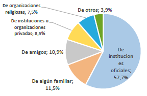 Un primer acercamiento a las redes de apoyo a las que recurren los mayores que viven en calle en Bogotá se encuentra en el Censo 2017 de esta población. Como se sintetiza en la figura 2, este revela que las ayudas ofrecidas se distribuyen de manera desigual entre redes formales e informales, teniendo mucha mayor incidencia las primeras. Estas se ofrecen principalmente a través de instituciones oficiales, que cubren el 57 % de los encuestados, y de las organizaciones privadas o religiosas, que llegan a un total de 16 % de los casos, 8,5 % y 7,5 % respectivamente. Entre las redes informales, las ayudas procedentes de redes familiares y de amigos alcanzan al 11,5 % y 10,9 % de los encuestados respectivamente, y son minoritarias las ayudas procedentes de otros agentes (3,9 %).