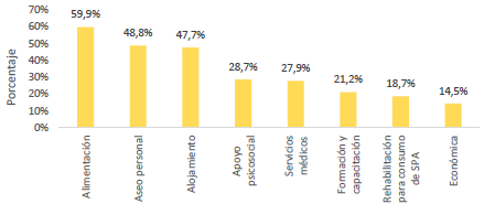 Las transferencias que se movilizan en esas redes tienen que ver principalmente con recursos materiales como alimentos, implementos de aseo personal y alojamiento (que fueron señaladas por el 59,9 %, 48,8 % y 47,7 % de la población correspondientemente). En menor medida, se obtuvieron ayudas instrumentales, referidas al apoyo psicosocial y servicios médicos (28,7 % y 27,9 %); así como las cognitivas, relacionadas con la formación, capacitación y rehabilitación (21,2 % y 18,7 %). Las menos frecuentes son las ayudas económicas, recibidas por el 14,5 % de los encuestados (figura 3).