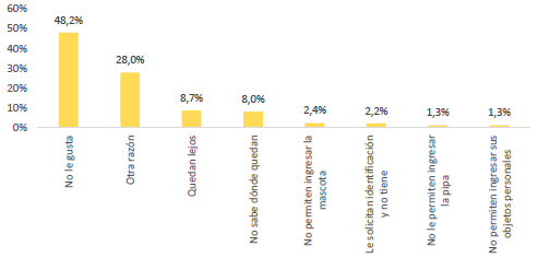 Cabe resaltar que, como se dijo antes, no toda la población acude a estos servicios. Según el Censo de Habitantes de Calle de 2017, entre los mayores que viven en calle que no los utilizan (422), la mitad afirma que "no le gustan", el 16 % dice que le "quedan lejos" y el 8 % "no sabe dónde quedan". Asimismo, proporciones muy pequeñas afirman que no acceden a los programas por las condiciones que estos imponen, como no poder ingresar su pipa, su mascota o sus elementos personales (Figura 6).