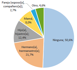 Al indagar por los contactos con la red familiar de los adultos mayores en calle, el Censo de 2017 demostró que en más de la mitad de los casos se ha perdido toda relación con la familia. Las relaciones que se conservan se establecen principalmente con hermanos o hermanastros (21 %), mientras que tan solo el 12 % mantiene contacto con "hijos, hijastros" (Figura 7). La relación con padres, parejas y otros parientes resulta marginal.