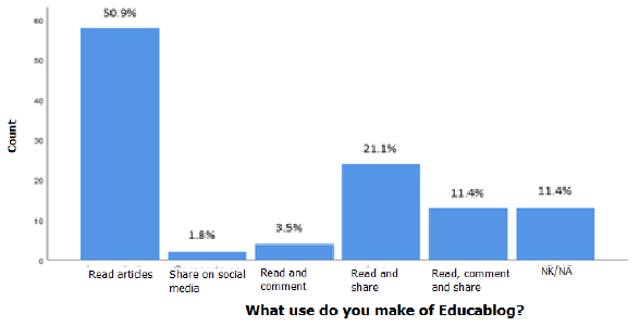 Lastly, in relation to the uses given by users to EducaBlog, the majority n = 58 (50.9%) read articles, as presented in Figure 1.