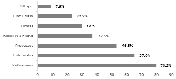 As for the sections of the blog, both the number of sections used and those that are not used are analyzed. In this sense, the most browsed section is "Reflections", with 70.2% (n = 80), as shown in Figure 2.
