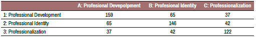 Likewise, the qualitative analysis indicates that people with more than 10 years of work experience approach the three topics of analysis equally, while those with less than 10 years of experience speak, to a greater extent, of professional identity, then about professional development and, to a lesser extent, of professionalization.
