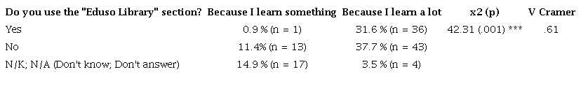 Likewise, Table 10 shows a statistically significant association between the use of the Eduso Library and the reason for use (something and a lot), with a high effect size: x2 = 42.31, p = .001, V Cramer = .61.