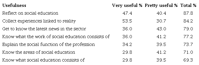 In relation to current knowledge of this sector, 43.0% (n = 49) indicate that it is quite useful; 36.0% (n = 41), that it is very useful; 15.8% (n = 18) make a neutral assessment; and 2.6% (n = 3) said both somewhat useful and not very useful. Continuing with the usefulness regarding knowing what the work of social education consists of, 41.2% (n = 47) indicate that it is quite useful; while 36.0% (n = 41), very useful; 18.4% (n = 21) make a neutral assessment; 2.6% (n = 3) somewhat useful; and 1.8% (n = 2), little useful.