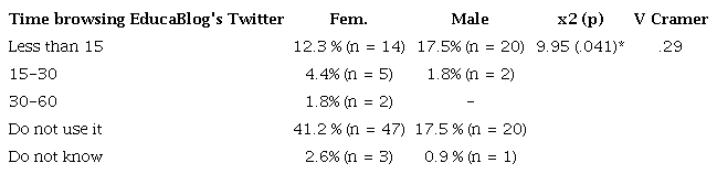 In addition, Table 4 shows the statistically significant associations: x2 = 9.95,p = .041, V Cramer = .29, for the use of Educablog's Twitter as a function of time and gender, with a moderate effect size.