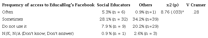 Moreover, there are statistically significant associations between the use of EducaBlog's Facebook and professional occupation (among social educators and others), with a moderate effect size: x2 = 8.76, p = .033, V Cramer = .28, as shown in Table 5.
