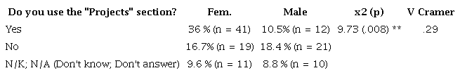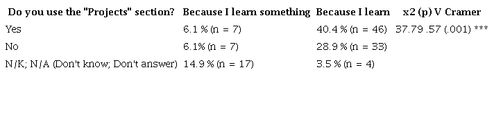 Table 8 shows the statistically significant association between the use of the Projects section and the reason for its use, specifically in the categories of something and a lot. The statistic is significant as it shows a high effect size: x2 = 37.79, p = .001, V Cramer = .57.