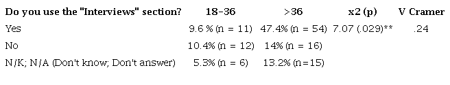 Likewise, the use of the Interviews section shows a statistically significant association with age, with a moderate effect size: x2 = 7.07, p = .029, V Cramer = .24., as shown in Table 7.