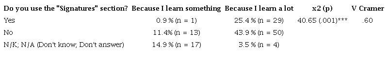 Table 9 shows the significant associations between the use of the Signature section and use ratio between something, and a lot ranges, with high effect size: x2 = 40.65, p = .001, V Cramer =.60.